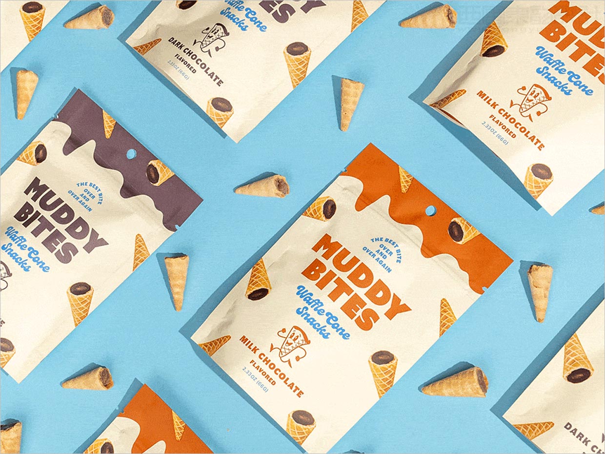 有一個冰淇淋甜筒,最好的一點是最后一個,你確切地知道我在說什么。Muddy Bites 是一種新品牌的華夫餅錐零食,通過制作一袋美味的最后一口,讓我童年的夢想成真。Colony 為零食救星設(shè)計了包裝,同時具有精美的懷舊和超前思維。這當然不是一種您可以通過平易近人的排版、可愛的小插圖和其中的小吃圖片忘記的小吃。Muddy Bites 旨在捕捉一次又一次享受完美最后一口的體驗。隨著直接面向消費者的業(yè)務(wù)不斷擴大,該品牌與 Colony 的戰(zhàn)略和設(shè)計團隊合作,尋求更新。要求是重塑他們標志性的食物,包括一個新的品牌標識和包裝系統(tǒng),傳達一次享受重復(fù)享受的純粹幸福。這是你二十次的初吻,永無止境的過山車,幸福倍增。Muddy Bites冰淇淋甜筒快消食品logo與包裝設(shè)計的靈感來自老式蘇打水噴泉和無處不在的童年懷舊之情,即大嚼冰淇淋蛋卷。我們的使命是捕捉和現(xiàn)代化這種感覺。我們首先清理和簡化了標志,讓積極向上的品牌個性在設(shè)計的各個方面閃耀。新標志采用粗大的無襯線字體,向復(fù)古冰淇淋店致敬,同時也給人永恒、標志性和更新的感覺。Muddy Bite 修改后的調(diào)色板再次給人一種懷舊但現(xiàn)代的感覺,利用了一種年輕、干凈和平衡的明亮、性別中性的藍色。調(diào)色板經(jīng)過專門設(shè)計,可隨著品牌產(chǎn)品線的不斷增長和新口味的推出,留出擴展空間。最后,以友好的動畫錐形尖端的形式引入了一個說明性組件,名為 Buddy。Buddy 是一種角色裝置,很容易讓人聯(lián)想到周六早上的卡通或復(fù)古代言人,為品牌固有的懷舊和歡呼加倍。Muddy Bites 的新品牌標識現(xiàn)已抵達全國各地,一次只送一袋幸福。